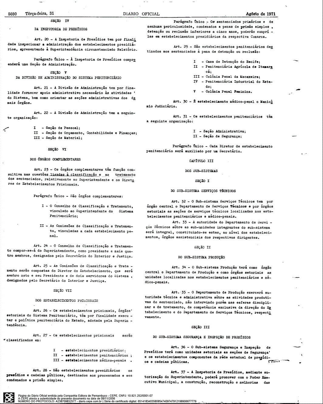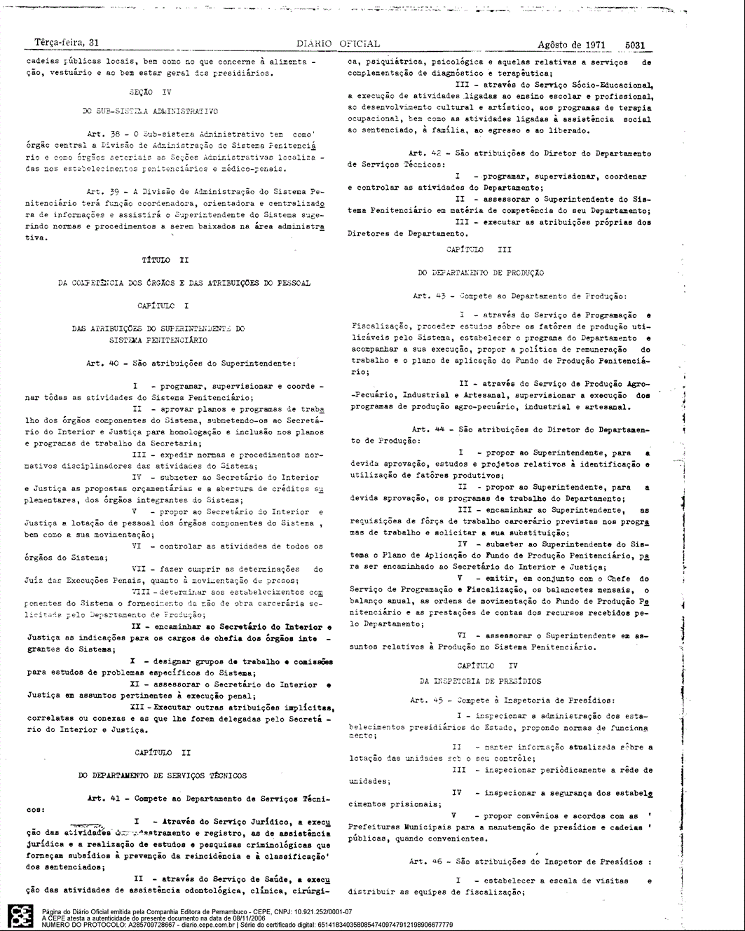 Nesta busca nos Diários oficiais ainda em forma de impressos foram encontrados o Regulamento do Sistema Penitenciário, através do Decreto nº 2404, de 27 de agosto de 1971, que alterou o Decreto nº 2340, de 13 de março de 1971. Este regulamento não teve alteração, foram criados durantes os anos novos organogramas de Secretarias, manuais , porém nunca um regulamento.